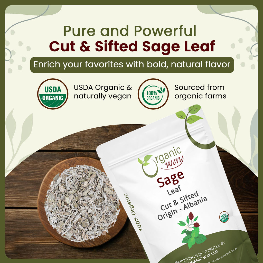 Product Description: Our Sage Leaf is organically grown in Albania and imported to USA after proper examination before import. After microbial and metal testing our products are certified by USDA and Kosher. Organic Way's Sage Leaf, Cut and Sifted is a popular herbal product and serves as a supplement for depression, alzheimer's, diarrhea, heartburn and other conditions.