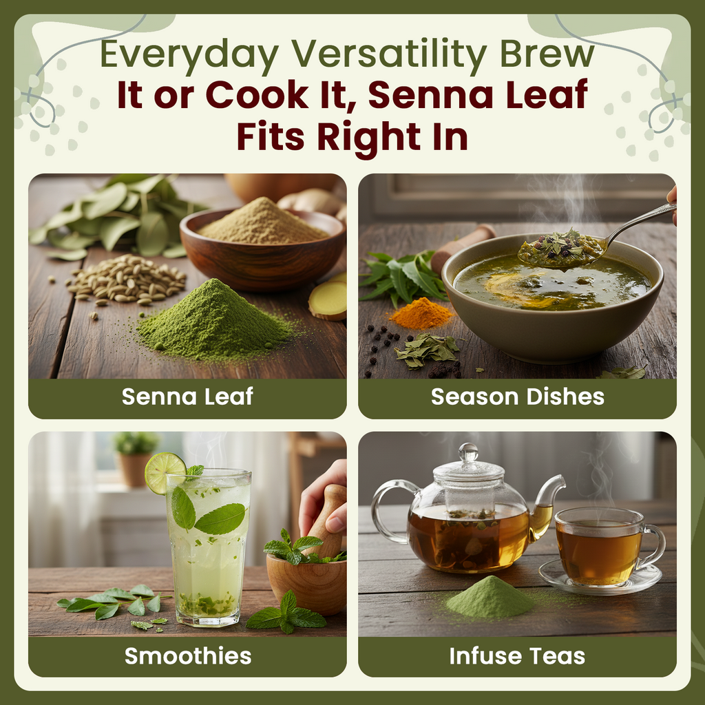Beyond teas, Senna Leaf Powder is valued in a variety of uses. It can be incorporated into DIY herbal mixes, combined with herbs and spices for seasoning, or stored as part of your collection of organic loose leaf tea and powders. Offered in convenient packaging, it is also available as bulk senna powder, making it an ideal choice for regular use at home, in cafés, or for blending with other natural ingredients.